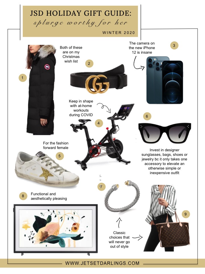 [1. Canada Goose Down Parka // 2. Gucci Double G Leather Belt // 3. Apple iPhone 12 // 4. Peloton Bike // 5. Golden Goose Sneakers // 6. Celine Sunglasses // 7. David Yurman Cable Bracelet // 8. Samsung Frame Television // 9. Louis Vuitton Neverfull MM]