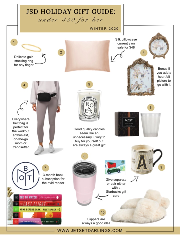 [1. Gold Stacking Ring // 2. Mulberry Silk Pillowcase // 3. Victoria Frame // 4. Everywhere Belt Bag // 5. Diptyque Candle // 6. Nest Candle // 7. Book of the Month Club Subscription [3-months] // 8. Yeti Rambler Tumbler // 9. Tiled Margot Monogram Mug // 10. Fuzzy Slide Slippers]
