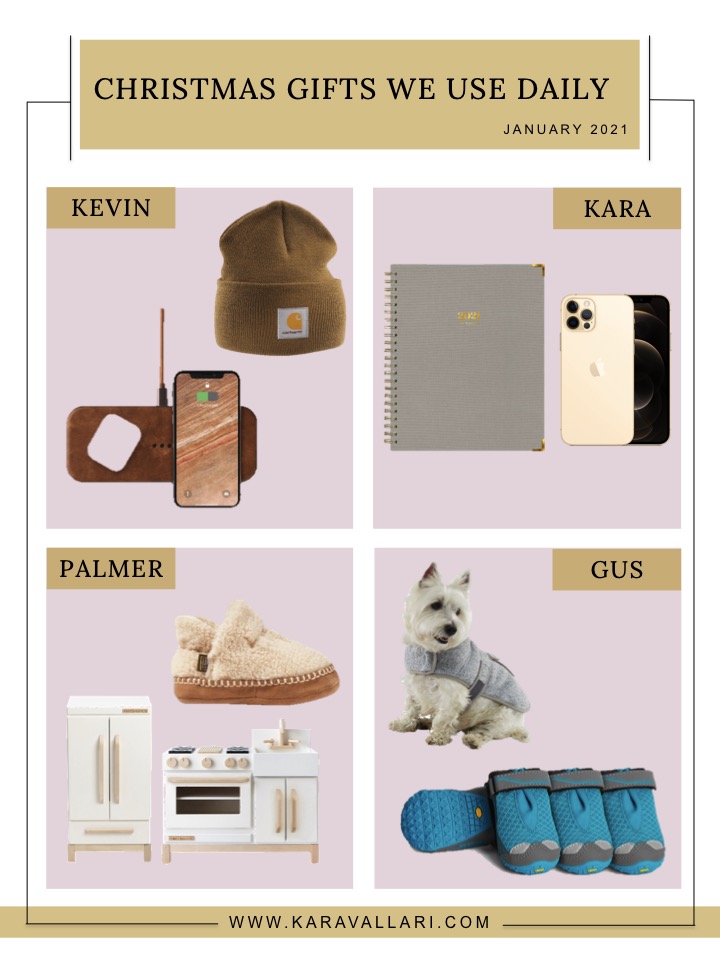 We’re almost a month out from Christmas now so I thought it would be fun to do a post on the Christmas gifts we’ve used almost daily since we opened them. It’s been eye opening to see which gifts deliver the biggest bang for your buck and which are still in their original packaging. A few that made the list were definitely a splurge but many were under $50 and well worth it. One item not pictured that I’m sure will top the list is Kevin’s surprise gift to me – a Peloton! It hasn’t arrived yet but I’m already using the app to do workouts multiple times a week and I can’t wait to get spinning. I promise to report back with a review after I’ve tried it out. Cheers!