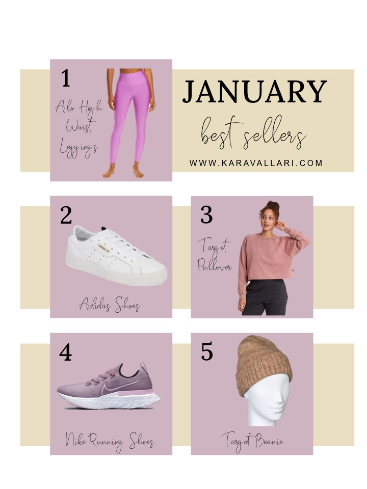 Hi Friends! I’m starting a new monthly series rounding up all the best sellers from the previous month. To be completely honest, I don’t sell a super large volume of anything [like maybe enough for one Chick-fil-A meal per week – LOL] but it is still interesting to see which items catch your eye. January’s best sellers include my favorite affordable white tennis shoes that go with literally everything and some of my all time favorite workout/loungewear pieces. Some items are still fully stocked so be sure to check them out if you like them too!