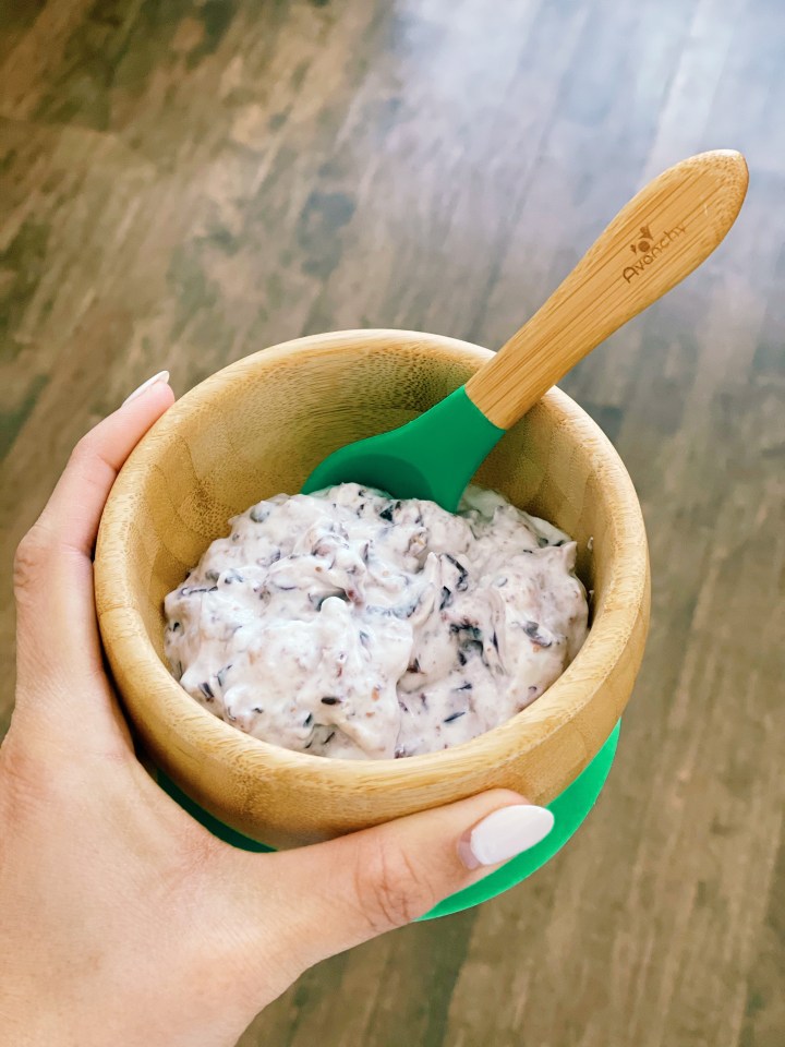 We’ve been giving Palmer plain, whole milk, greek yogurt since she was little and she loves it. To sweeten it up a little, I usually add some type of berry/fruit puree [e.g. blueberries, strawberries, raspberries, peaches, etc.].