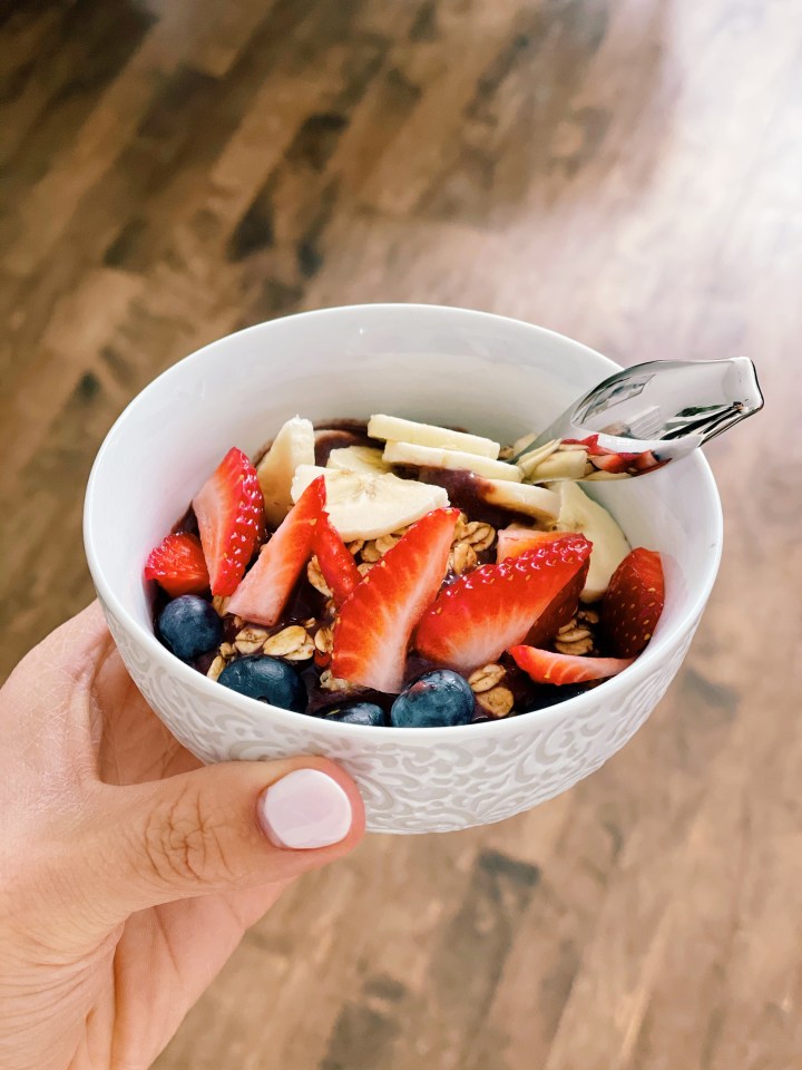 I can’t make myself an açaí bowl without Palmer wanting to share it so I’ve started making her her own mini bowl. Just be sure to use unsweetened açaí, avoid large chunks of granola and cut the fruit up smaller as they can get hidden in the açaí.