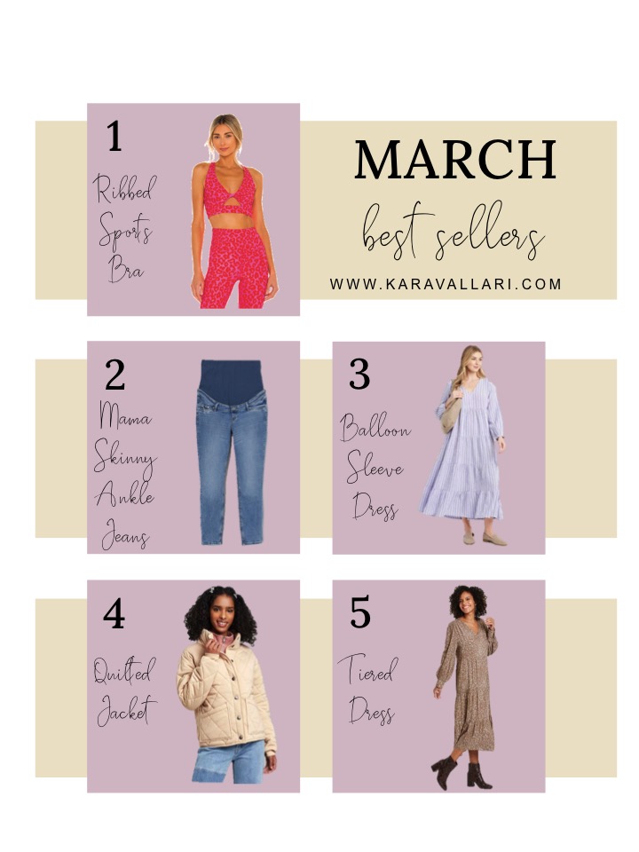 [1. Ribbed Sports Bra // 2. Mama Skinny Ankle Jeans // 3. Balloon Sleeve Dress // 4. Quilted Jacket // 5. Tiered Dress]